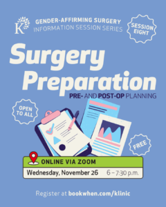 Join us for this free, informative session on prepping for surgery and gender-affirming care. This is a great opportunity to learn, ask questions, and gain practical knowledge in a safe and supportive virtual environment.