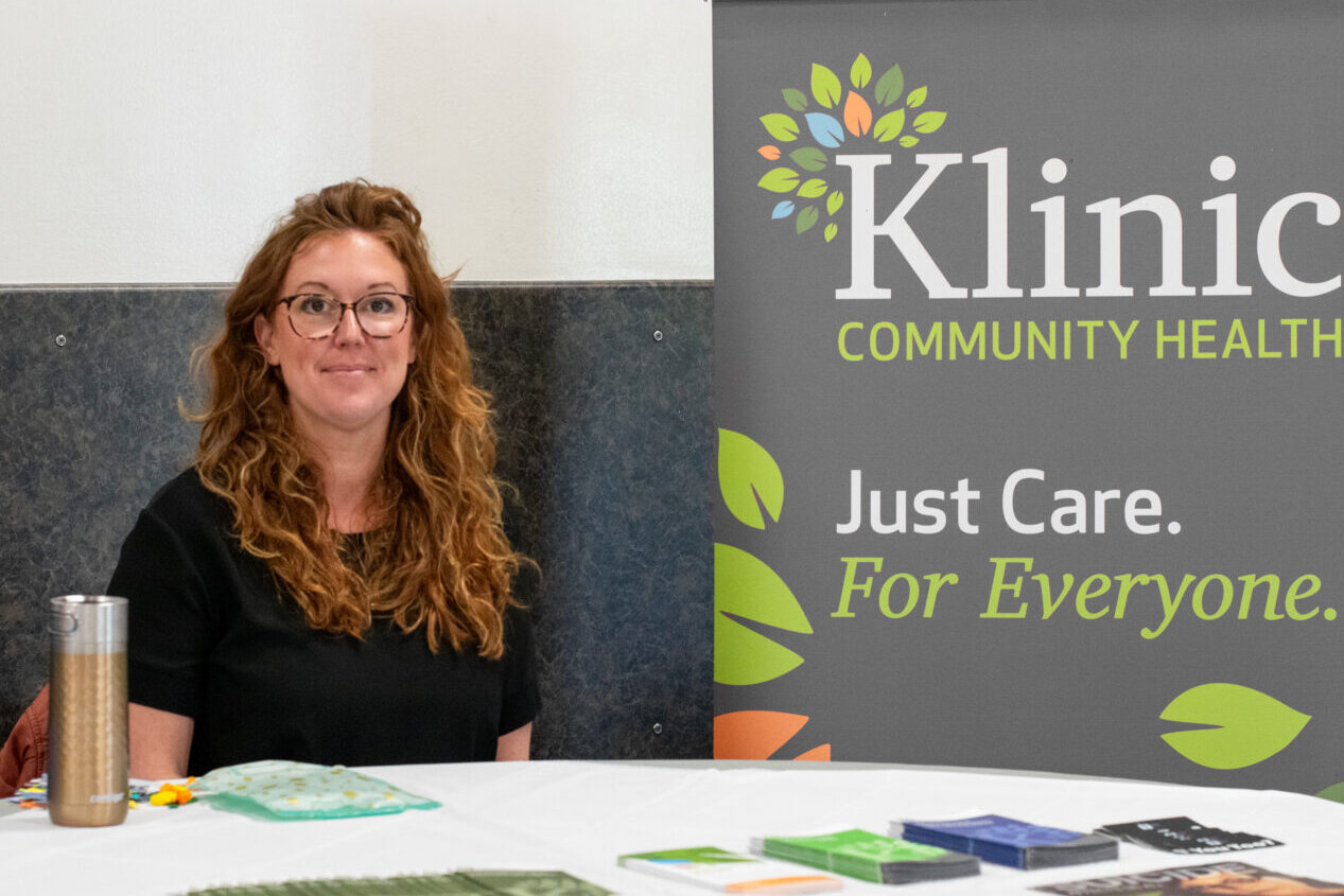 Erin sits at a table with resources.