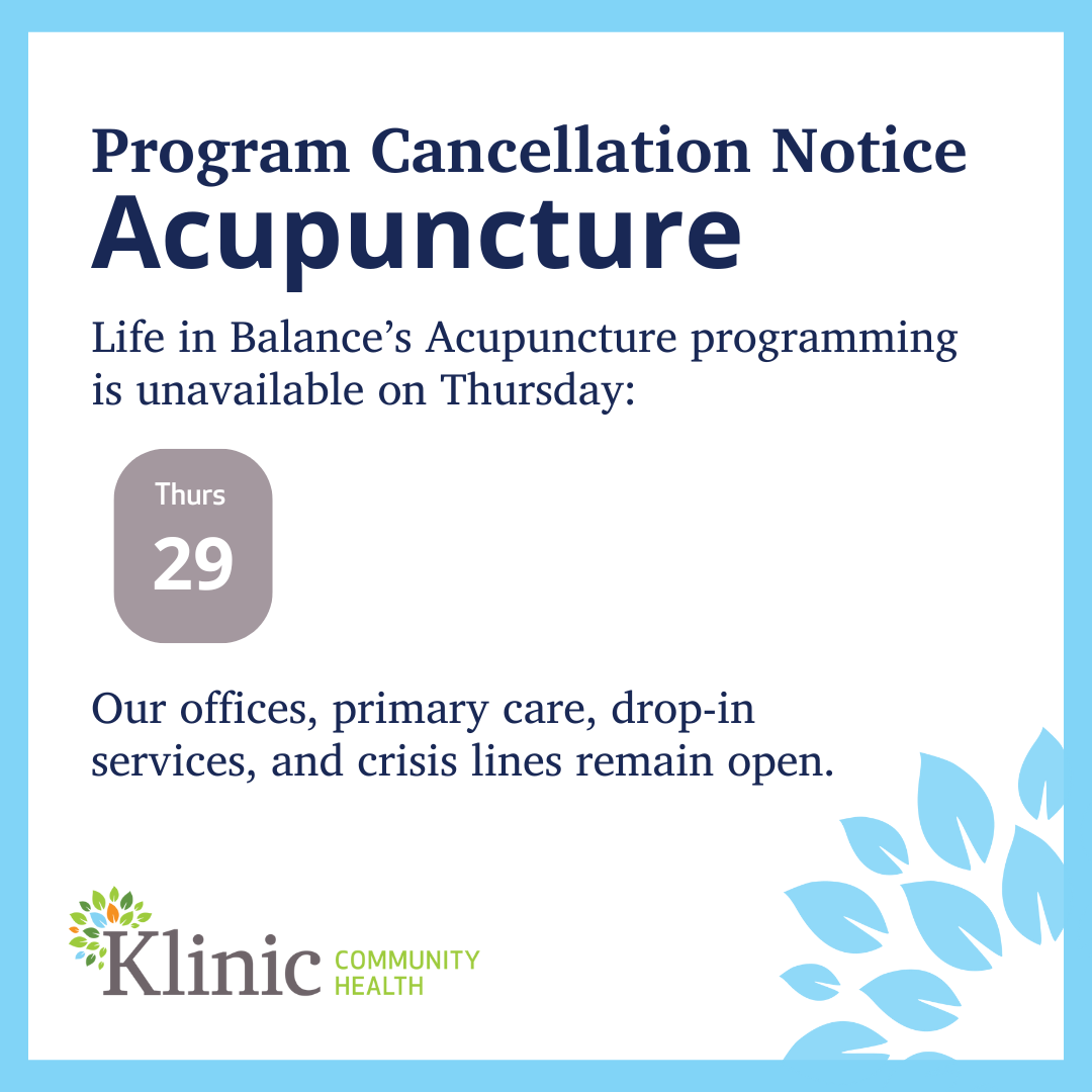 UPDATE: Klinic will close early tonight (Dec. 18) at 4 p.m. STI Klinic is cancelled tonight and Hummingbird Drum Group is cancelled tomorrow (Dec. 19). Due to the weather❄️, all in-person appointments are cancelled today (Dec. 18). We apologize for any inconvenience this may cause. Some clients may be contacted to switch their appointments to…