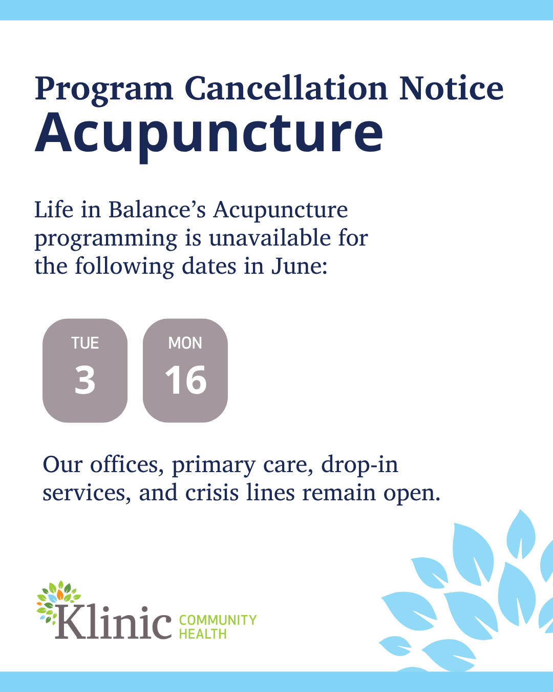 : June 3 and 16: Acupuncture CancellationJune 3 and 16: Acupuncture Cancellation