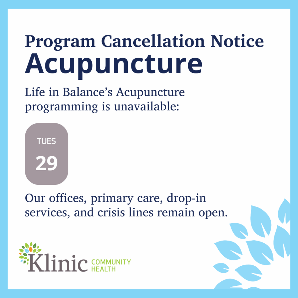 Program cancellation notice for today. April 29. Our Acupuncture program is cancelled today (April 29)! Our offices, primary care, and other drop-in services are operating at their regular hours today. Crisis Lines remain open 24/7.