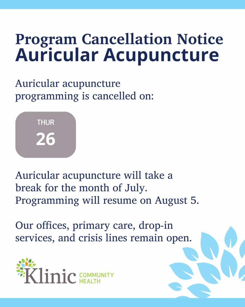 UPDATE: Klinic will close early tonight (Dec. 18) at 4 p.m. STI Klinic is cancelled tonight and Hummingbird Drum Group is cancelled tomorrow (Dec. 19). Due to the weather❄️, all in-person appointments are cancelled today (Dec. 18). We apologize for any inconvenience this may cause. Some clients may be contacted to switch their appointments to…