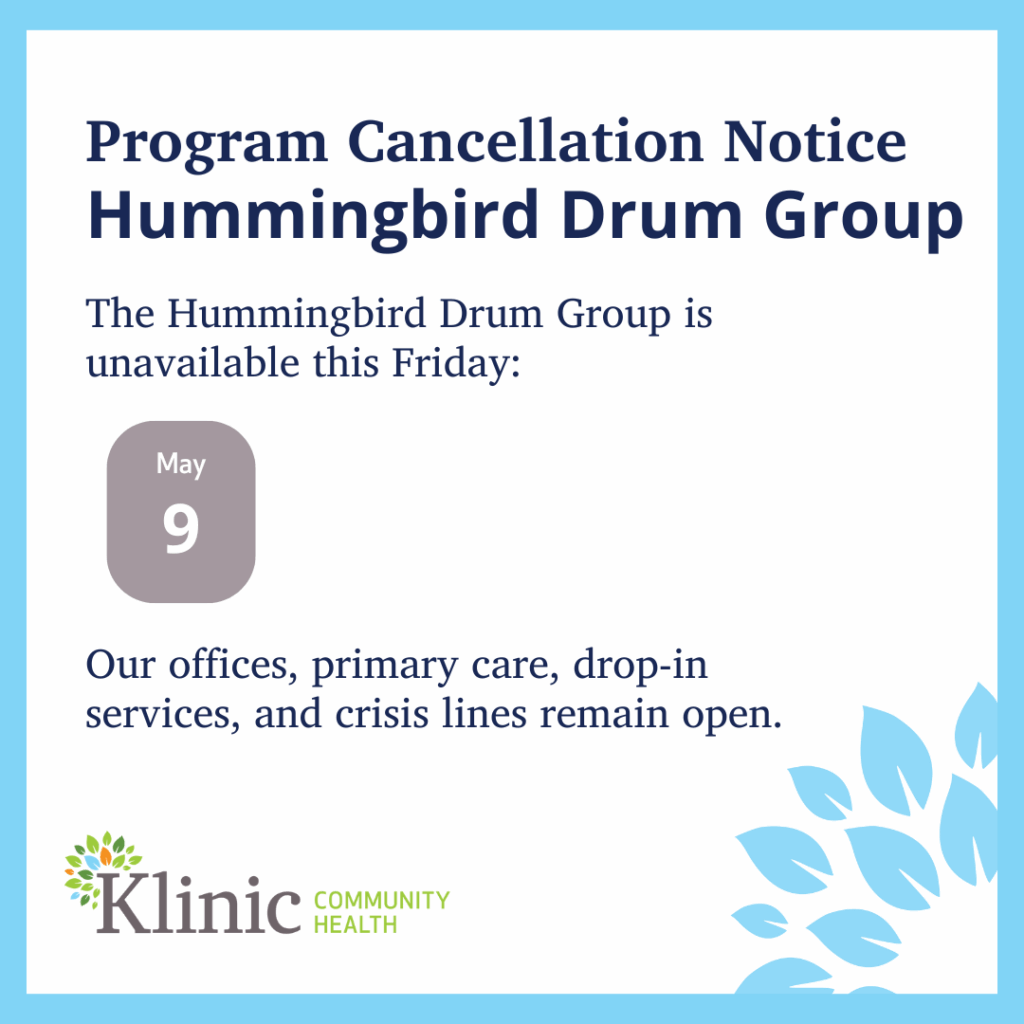 PROGRAM CANCELLATION NOTICE FOR TOMORROW The Hummingbird Drum Group is cancelled tomorrow (May 9)! Our offices, primary care, and other drop-in services are operating at their regular hours today. Crisis Lines remain open 24/7. hummingbird drum group cancellation for may 9
