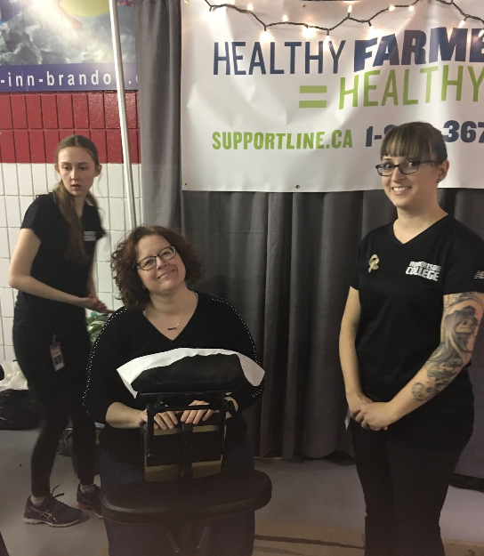 At Ag Days, we partner with Robertson College to offer free massages for folks who come to our display – a great way to get people into our booth and spread the message of self-care. Fascinating side note: do you know what ‘farmer’s neck’ is? That is when a farmer looks over the same shoulder for years on the tractor, and it causes intense neck strain. Most farmers do not have private insurance, as they are largely self-employed, so have no massage benefits (or EAP for that matter).