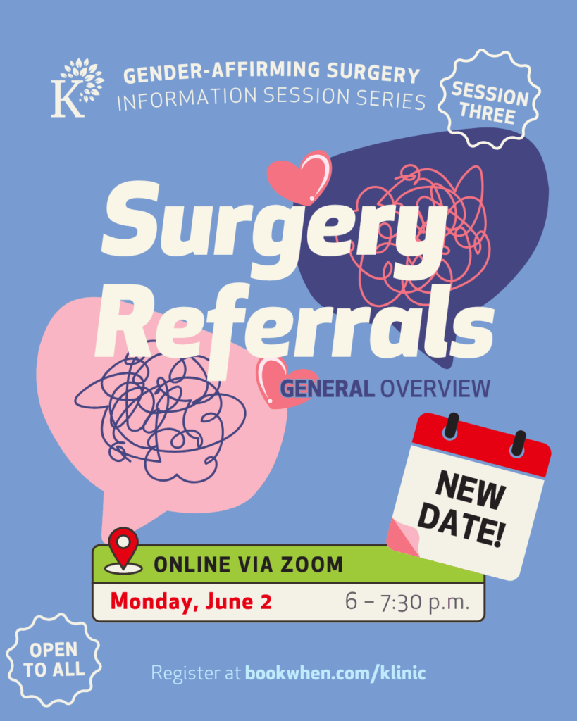 Our recently postponed Gender-Affirming Surgery Information Session has been rescheduled! New date: Monday, June 2 Time: 6 – 7:30 p.m. Location: online on Zoom Register at bookwhen.com/klinic