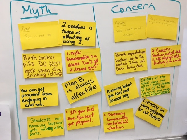 It’s an annual event in Manitoba that every October teachers across the Province come together at various venues to participate in professional development at Special Area Group Education (SAGE). SAGE is a very important opportunity for educators to advance their skills and knowledge in areas that are relevant to them and will help them work with students over the upcoming year. Unless you have participated in SAGE, it is hard to understand its breadth and size, and I can’t imagine what it takes to organize. It is an honour that both the organizations I work with, SERC and Klinic, are annually invited to help these hardworking educators expand their knowledge, particularly in the area of teaching sexual health as part of the Manitoba Health Curriculum. This year, I went out with Gina McKay, a Sexual and Reproductive Health Facilitator from SERC to sit in on her session with teachers. The first thing I notice as I walk into today’s venue (Windsor Park Collegiate) is that there are teachers everywhere, and there are student leaders who are trying to help direct them in what appears to be a fascinating reverse experience of the first day of school. The students are patient and helpful , and they direct me to the room Gina is already setting up in. I am delighted to run into two of Klinic’s Teen Talk staff who are also giving a presentation entitled, Sex Ed without blushing, I wish I could be in both of these at once! Gina with Helena and Hema from Teen Talk As Gina describes the goals for the hour and a half session, I am both awed and concerned. I can’t help but think of how much these teachers are expected to know. It seems to me an awesome responsibility that we put on teachers, to help our children and youth understand the world in a manner that hopefully keeps them, and others, safe and successful in so many critical areas of life. Both Klinic’s Teen Talk program and SERC provide education for educators to support the health curriculum. Unfortunately, we do not have the resources to be in every classroom, so it is critical that we work together with partners to support the folks who are in the classrooms every day. Gina starts by saying that this is one part of a two-day teacher training that we do with school divisions. The curriculum is from 2005 and forms a great basis but does need regular resource updating, given the rapidly changing world of sexual health– this is something we can assist with. Gina talks about which divisions are currently scheduled to do sessions with and how they can participate; most of the Winnipeg divisions have upcoming trainings scheduled, some in partnership. She notes that SERC is an approved educational resource for curriculum, and resources are peer-reviewed and regularly updated. One of the things I really appreciate when I see SERC offer sessions, regardless of the audience, is the factual non-judgmental way materials are presented. In this session I appreciate how Gina does this while acknowledging the challenges that can come from many places when teaching these topics. For example, working with parents who are concerned about what the curriculum is teaching, or administrations that are possibly unsupportive to some of the messaging. Gina is able to give good advice on managing these realities while being respectful of all involved. One of the ways she does this is by offering help. For example: maybe you have a youth who is transitioning and you are not sure what to do next– we can come meet with you and your school. Teaching birth control? We can lend you a kit! Worried about offering a parent group? We can do this for you. If you have read some of my previous posts, you may have seen me talk about my experience with Fast Pitch Winnipeg. My Fast Pitch was based on the work SERC does in the Facts of Life Program and it is great to see how much it fits with Gina’s session. She reminds teachers they can email questions anytime, and so can their students. In addition, she spends lots of time talking about the magical, anonymous question box. How can we make it feel safe? She gives tips about rewriting questions. What if the question feels beyond what I can answer? She talks about finding resources and talking to their administration. Gina also talks about something I emphasize in fast pitch. Our youth are savvy and online, we need to give them the right sources, like SERC’s website, to ensure they are not getting inaccurate advice. Ultimately, Gina emphasizes, it is about creating the environment for those questions to be asked, which reminds me of SERC’s new intention statement ( I wrote about it in a recent blog entitled Palaces of Vulnerabilities). How can we create safe spaces for people to talk about sexuality and sexual health? They may not remember what chlamydia was, but they will remember if you are someone they can talk to about it. Gina asks the teachers to participate in an activity we also use with youth. Each person is to identify common myths they have heard from their students. These are some examples: