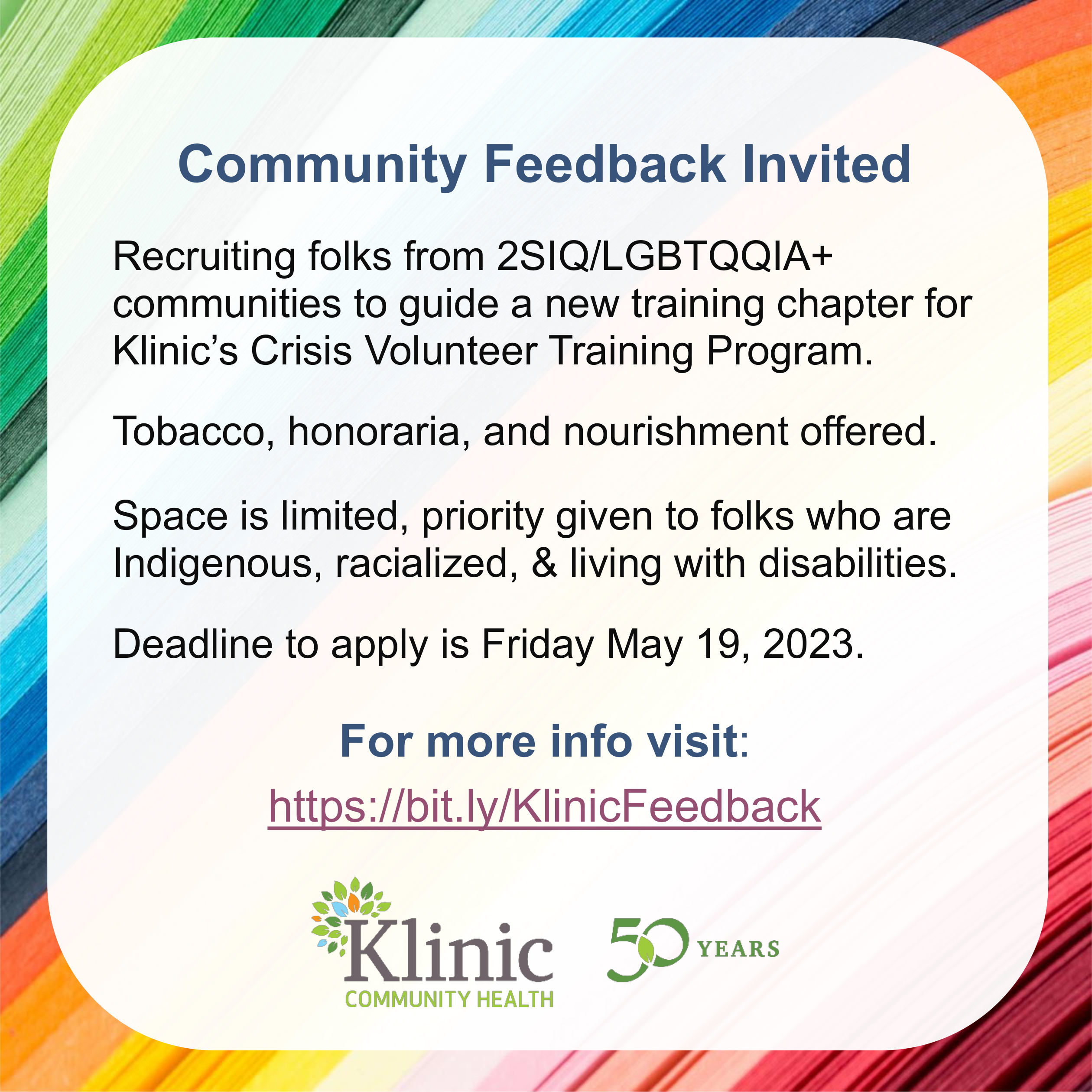 : Klinic Welcomes Feedback from 2SIQ/LGBTQQIA+ Communities for Crisis Volunteer Training ProgramKlinic Welcomes Feedback from 2SIQ/LGBTQQIA+ Communities for Crisis Volunteer Training Program