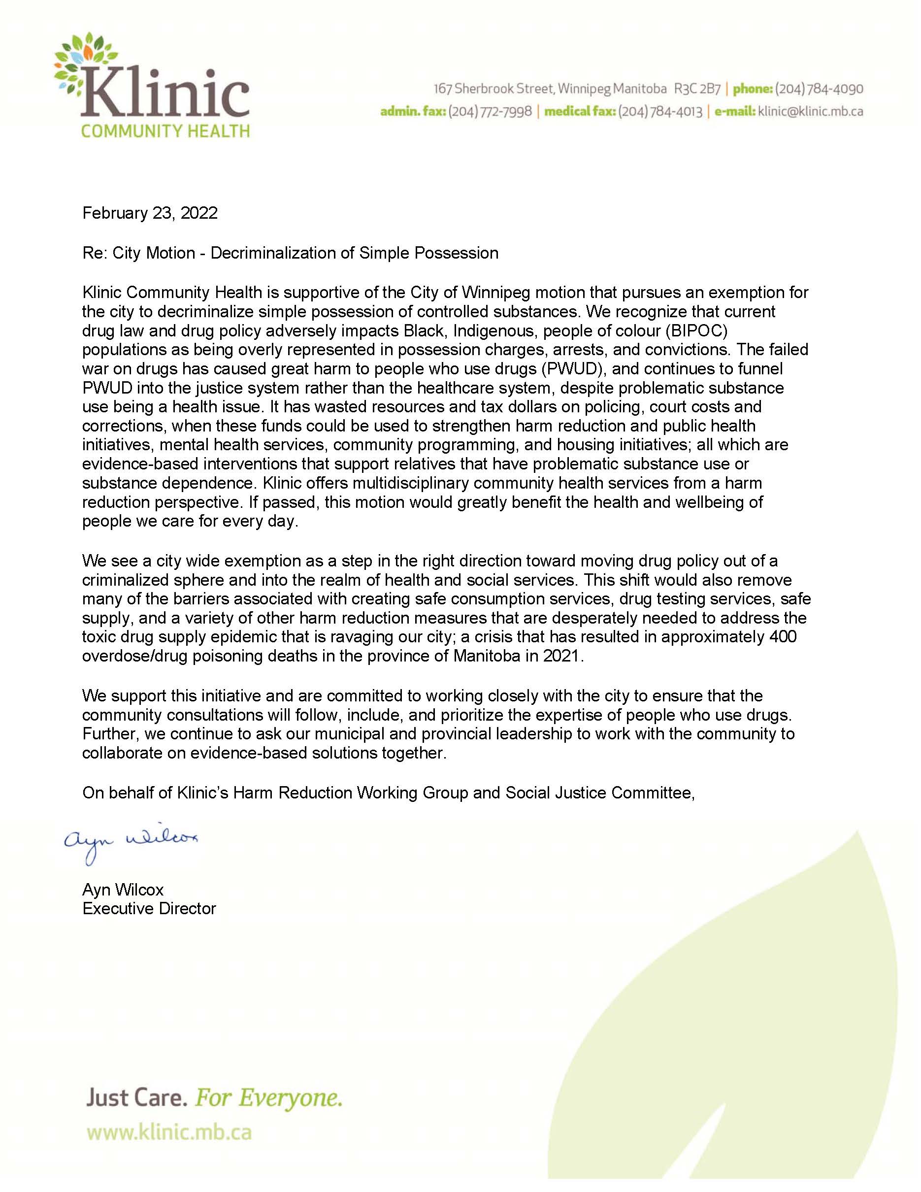 : Klinic's Letter to City Council re: Decriminalization of Simple PossessionKlinic's Letter to City Council re: Decriminalization of Simple Possession