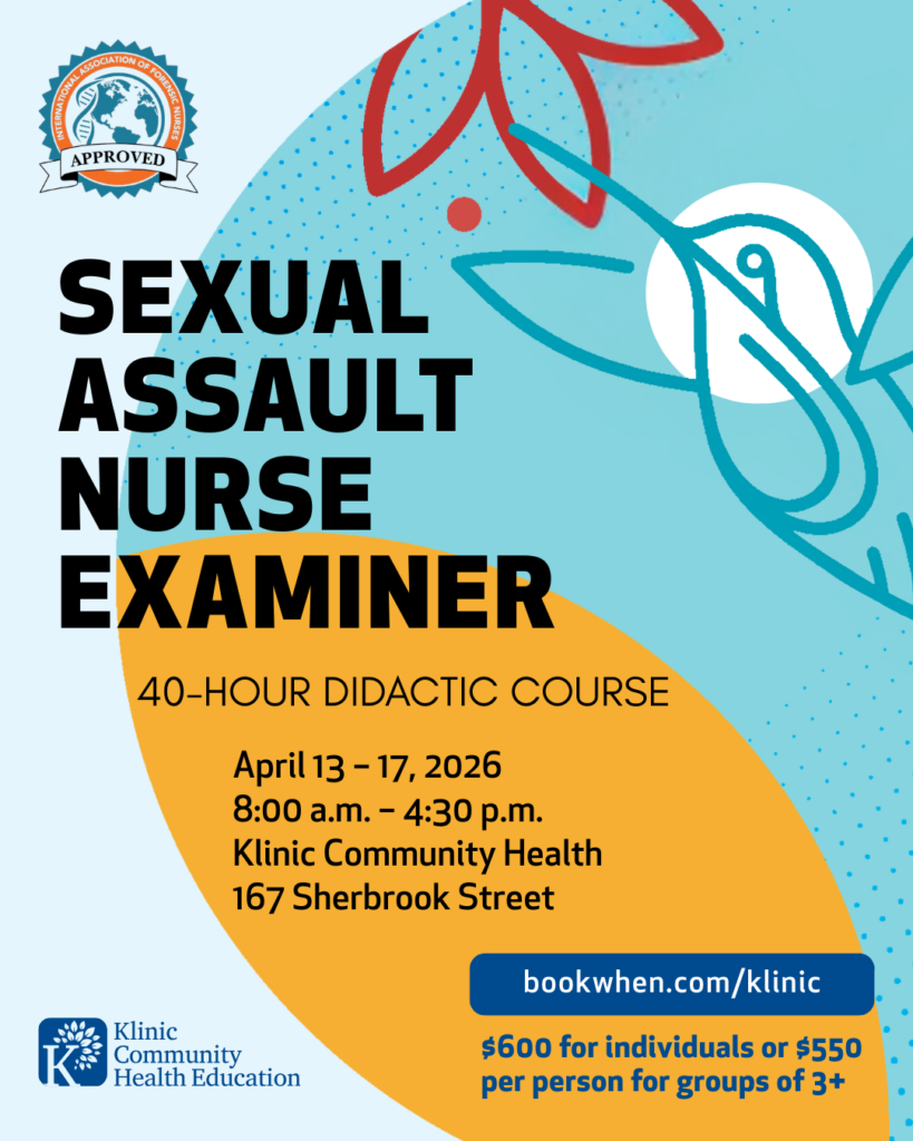 Klinic’s Hummingbird Program is offering the Sexual Assault Nurse Examiner (SANE) Didactic Course this April, a 40-hour continuing education opportunity for licensed and registered nurses. Led by expert Hummingbird practitioners, this week-long training provides the theory and knowledge needed to deliver compassionate, trauma-informed care to individuals who have experienced sexual assault. The course meets the International Association of Forensic Nurses (IAFN) Education Guidelines. For more information, please contact Ashley Stewart at astewart@klinic.mb.ca or at 204-784-4085.
